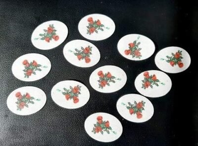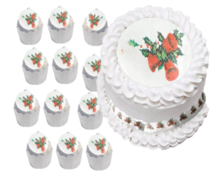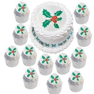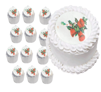 24 Round Pre-cut Edible Holly leaves, Berries & Jingle Bells Photo Wafer/Icing Paper Photo; 1.8″- Christmas Cupcake Toppers /Decorations