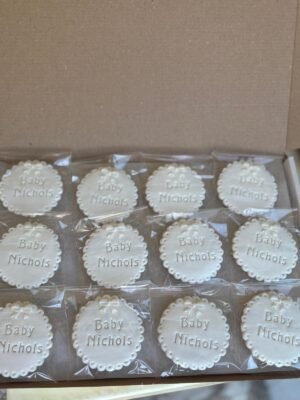 Customise Colour x10 Luxury SS Merry Christmas Cookies/Biscuits Branded Party favours/Gifts. Scalloped Round, White; 6.5cm